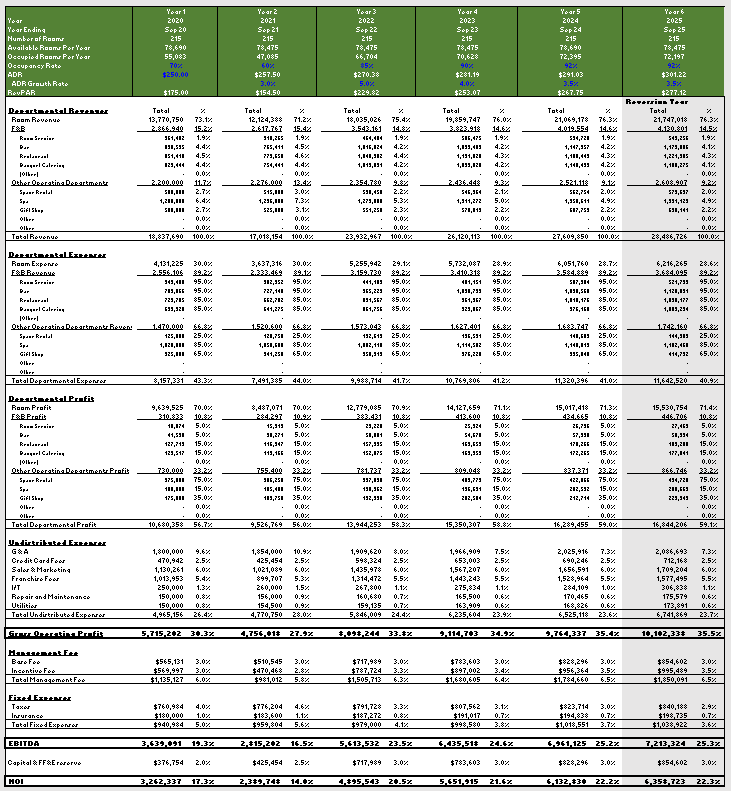 Unlike typical real estate, hotels have short-term tenants and multiple operating departments. The hotel proforma reflects this by breaking down revenues and expenses by department and adding detailed operational line items like Departmental Revenues, Undistributed Expenses, and Franchise Fees.
