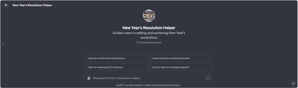 The ‘New Year’s Resolution Helper’ GPT is a reflection of my commitment to effective goal setting by bringing structure, accountability, and personalization to my resolutions. I hope you find value in using it.