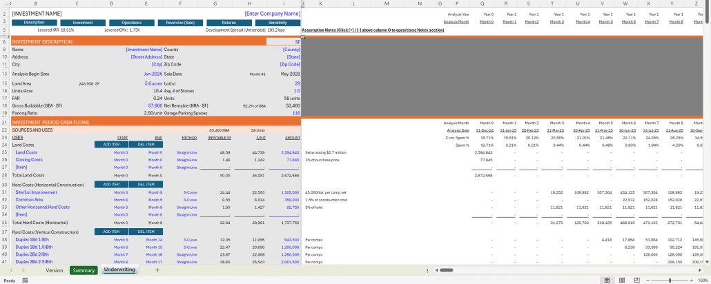 A robust, institutional-quality build-to-rent (BTR) development model with a simple and intuitive design. Includes an extensive development module, expandable unit mix capability, a commercial module, simple or detailed OpEx underwriting, single or double promote, basic sensitivity analysis, permanent debt module, and more. (View description of model)