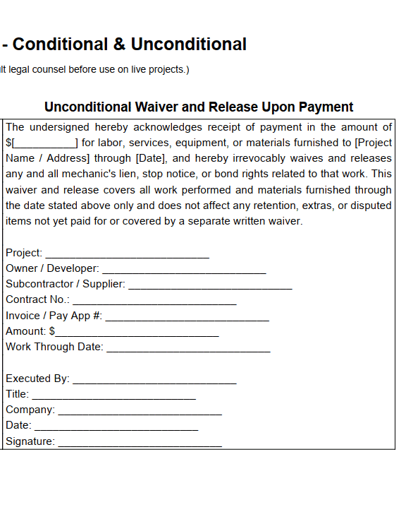 A lien waiver is a signed document from a contractor or subcontractor confirming they’ve been paid for work performed through a certain date, and that they waive any future right to file a lien for that work. To make it easier to apply this process to your own projects, we’ve created a free, downloadable Dual Lien Waiver Template: a one-page form that includes both the Conditional and Unconditional lien waivers side by side. You can use this to document each pay application as it moves from conditional upon payment to unconditional upon clearance, keeping your project records clean, defensible, and audit-ready. (View description of the template)