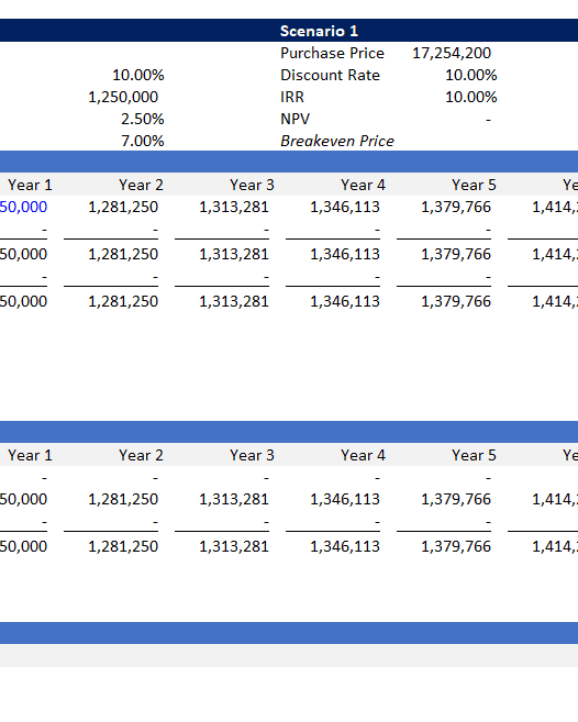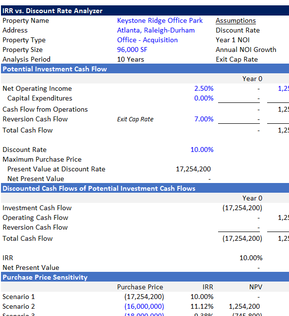 The IRR vs. Discount Rate Analyzer Model is a simple yet powerful educational tool designed to help real estate professionals understand the dynamic relationship between an investment’s internal return (IRR) and the investor’s required return (Discount Rate). Built in Excel, this model also illustrates how changes in purchase price impact both IRR and Net Present Value (NPV), thereby providing a clear, intuitive framework for pricing real estate deals. (View description of model)