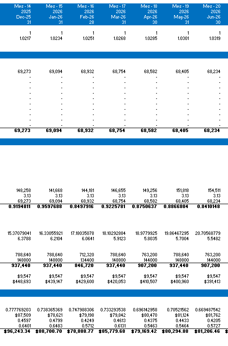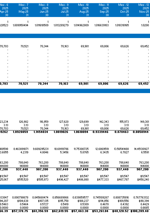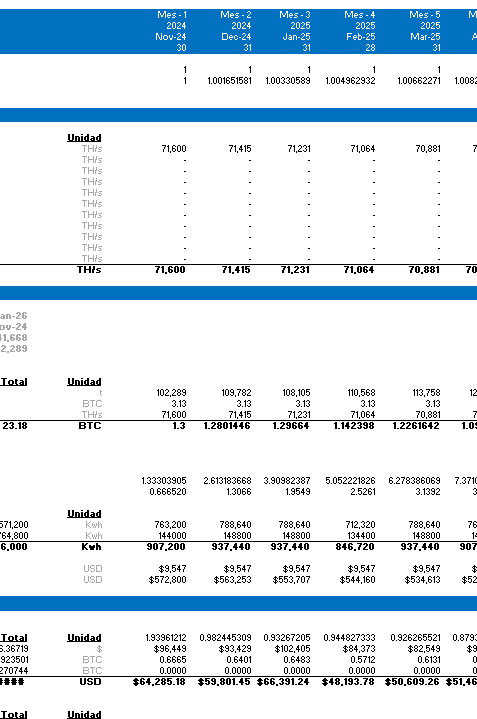 Este modelo estima la viabilidad financiera y los retornos de un proyecto de desarrollo de una granja de minería de Bitcoin. Conecta (1) el desarrollo del sitio y el despliegue de equipos (ASICs), (2) el consumo y costo de energía, y (3) los ingresos de minería impulsados por el precio de BTC, dificultad de la red, hashrate de los equipos y el efecto del halving en las proyecciones futuras. (Vea la descripción del modelo)