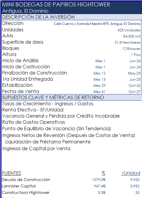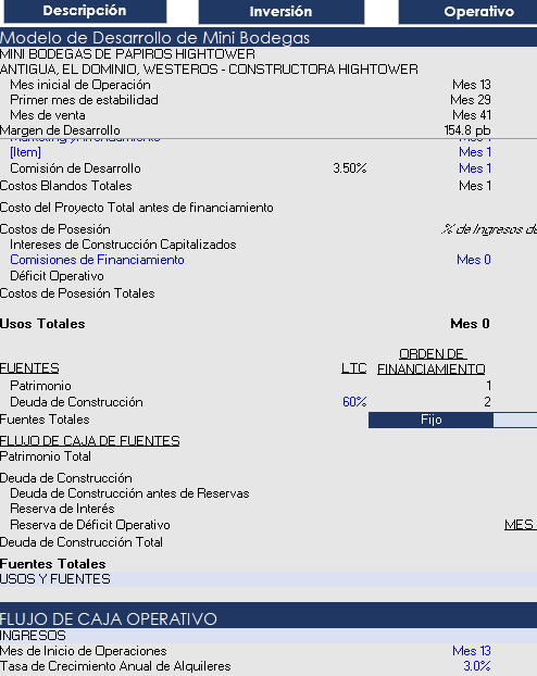 El Modelo Financiero para el Desarrollo de Mini Bodegas (Self-Storage), es un modelo financiero de desarrollo de instalaciones de almacenamiento de calidad institucional, diseñado con una estructura clara e intuitiva. Cubre el ciclo de vida completo del proyecto: desde la adquisición del terreno y la construcción, pasando por el arrendamiento y la estabilización, hasta la eventual venta del activo. (Vea la descripción del modelo)