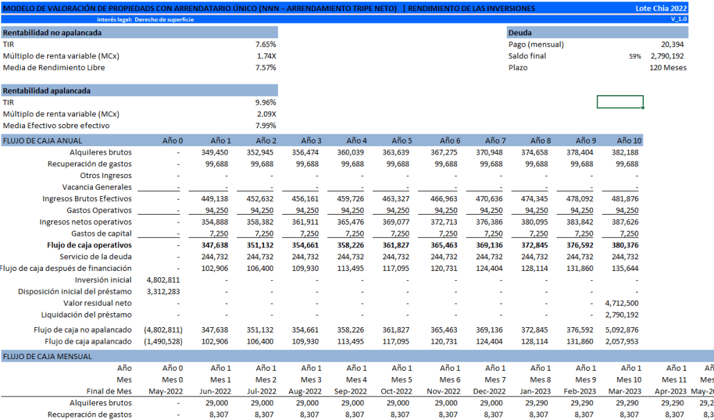 Un modelo financiero inmobiliario, creado en Excel, para valorar propiedades de arrendamiento triple neto de un solo inquilino. El modelo utiliza tres tipos de descuento, en lugar de uno, para valorar los flujos de caja de los ingresos crediticios, los ingresos especulativos y los ingresos residuales de una operación de arrendamiento triple neto. (Vea la descripción del modelo)