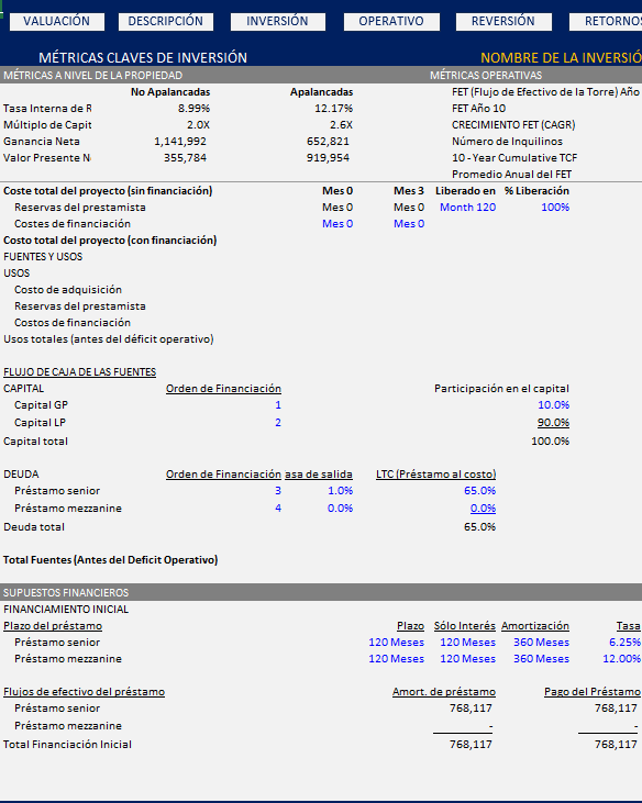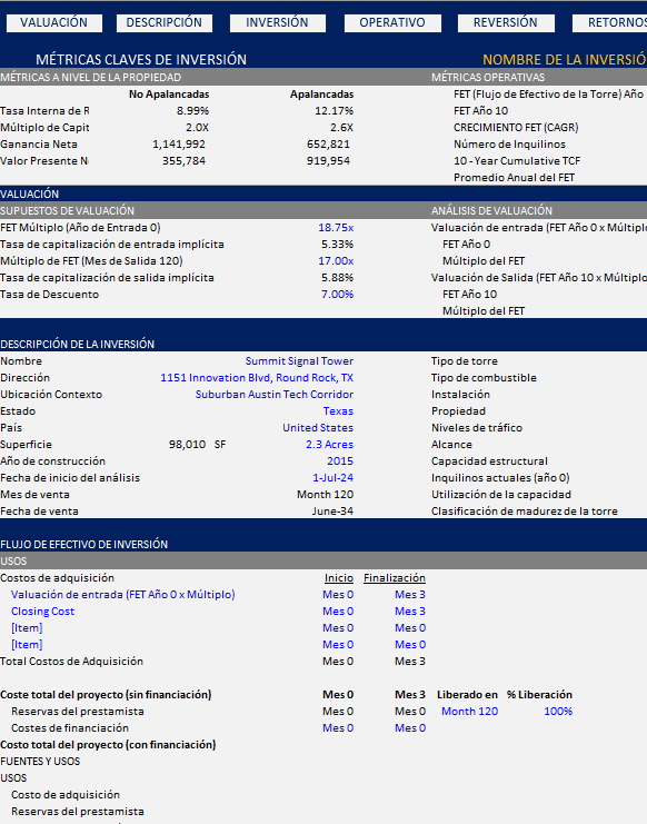 Construido para profesionales enfocados en la adquisición de activos de torres estabilizados o con estrategia value-add (renovación), el modelo proporciona la profundidad analítica necesaria para evaluar la durabilidad de los ingresos, calcular valores de reversión y estructurar transacciones con confianza. Es compatible con estrategias a lo largo de todo el espectro de riesgo-retorno, desde adquisiciones core hasta inversiones oportunistas con un horizonte de salida claramente definido. (Vea la descripción del modelo)