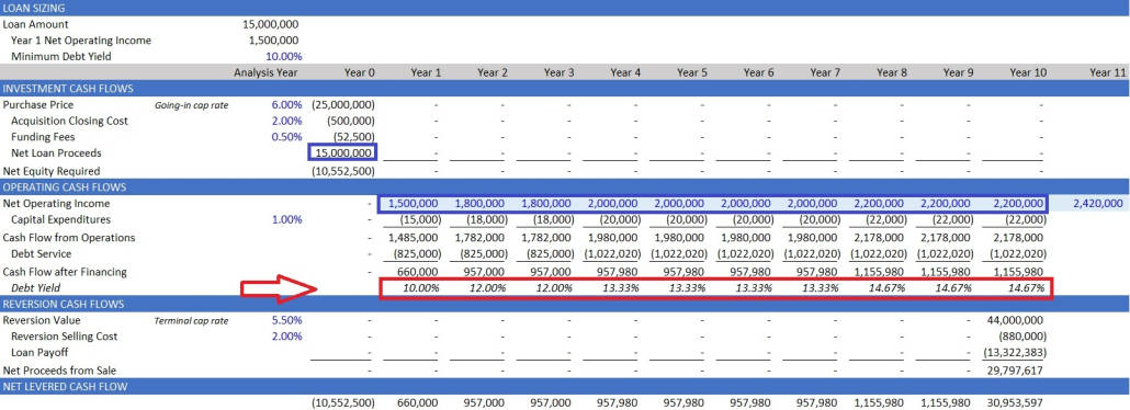 In this case, the investor would be interested in knowing the debt yield as a function of the outstanding loan balance (existing debt). This is what is known as “dynamic debt yield”.