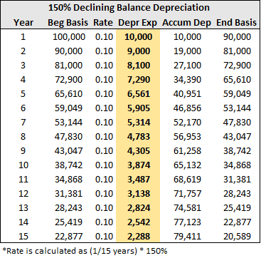 Land improvements require a 150% declining balance method and a 15 year depreciation period. Below is an example of a depreciation schedule for a $100,000 land improvement using the 150% declining balance method.
