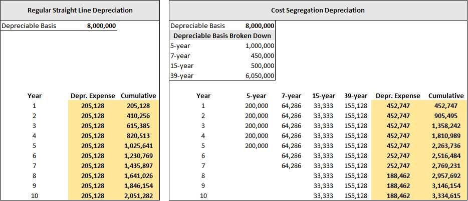 The example shows a made up building/structure value of $8 million. The left hand side shows the depreciation without using cost segregation and the right side shows the same building with cost segregation. With the straight line depreciation method over 39 years there is a steady $205,128 that can be written off every year, but with the segmented depreciation put in place we can see that $452,747 can be written off in the first five years, which is more than double, and then after the first five years this number decreases significantly.