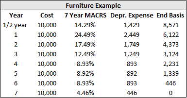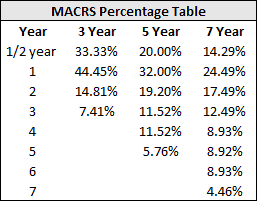 Personal property is usually depreciated using a MACRS (Modified Accelerated Cost Recovery System) and will have either a 3-year, 5-year, or 7-year depreciation period. However, it is assumed that all property is purchased and placed in service in the middle of the previous year. Below shows the MACRS Percentage Table: