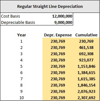 In this example, there is a purchase of a commercial property for $12 million, $9 million of which has been allocated to the building. Using straight line depreciation is simple in that all you do is take the depreciable basis and divide it by 39 years for a commercial building. In this example, we divided $8 million by 39 to get an annual depreciation expense of $230,769.