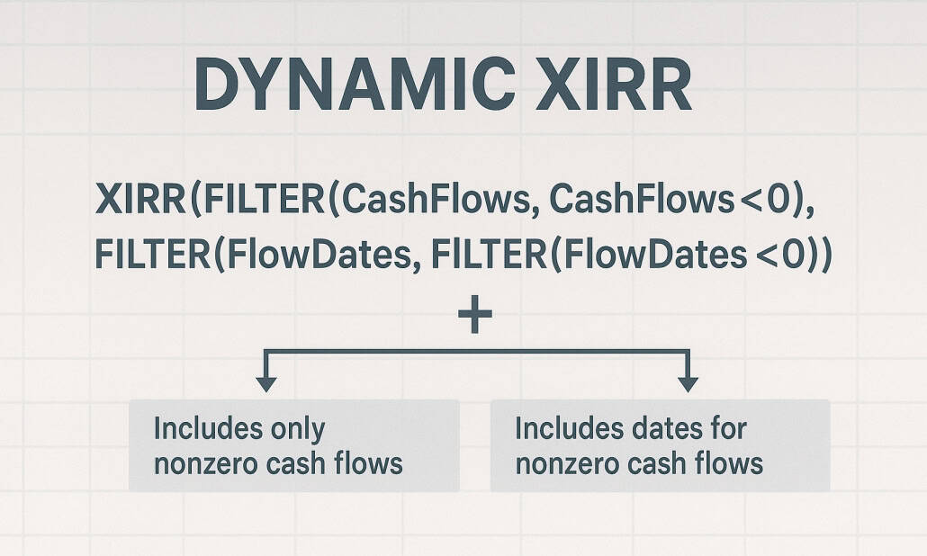 So, there you have it. A simple but powerful fix for one of Excel’s quiet frustrations. By combining XIRR() with FILTER(), you can make your IRR calculations dynamic to the first month of actual cash flow and eliminate those misleading 0.00% results once and for all.